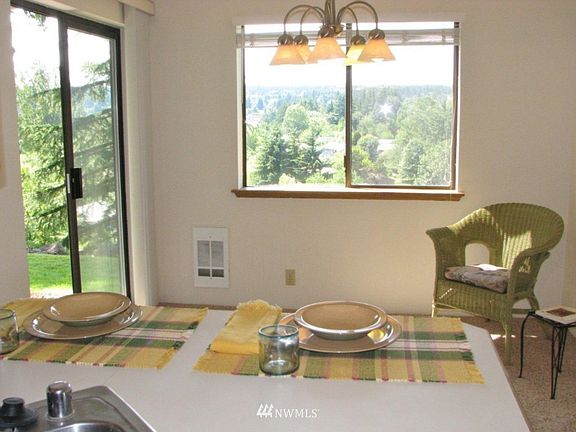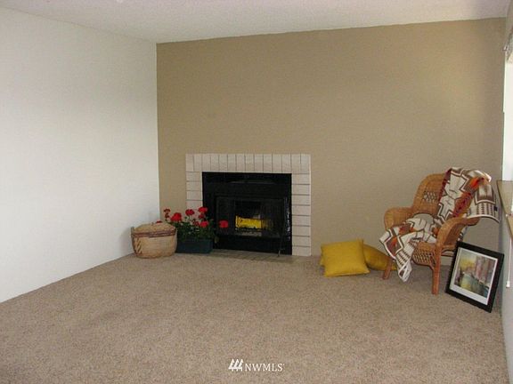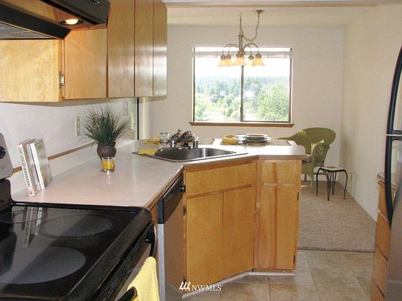 Charming ground floor condo in Vikings Crest. Great view of the Olympic Mountains and the valley below. Enjoy almost 1,000 sft with an open floor plan and cozy wood burning FP. Glass slider leads out to the cement patio w/storage area. Mastr has its own 3/4 bath. New 2" blinds throughout. Super clean and move in ready. Outdoor pool, clubhouse, exercise room and hot tub on the grounds. Convenient to shopping, Hwy and schools. Small dogs and cats are permitted with restrictions.