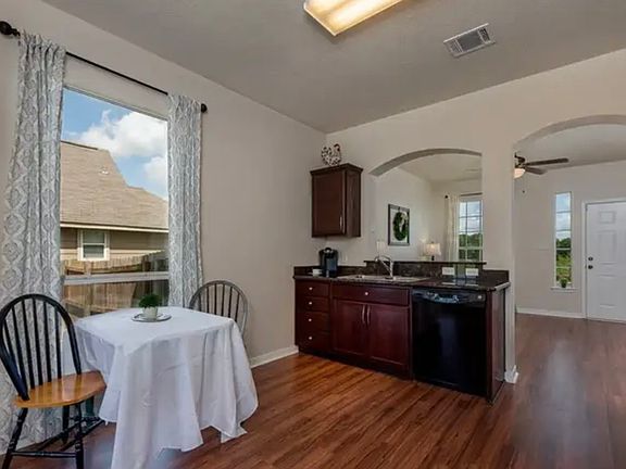 Modern kitchen with granite countertops and breakfast nook, flowing into a spacious living area