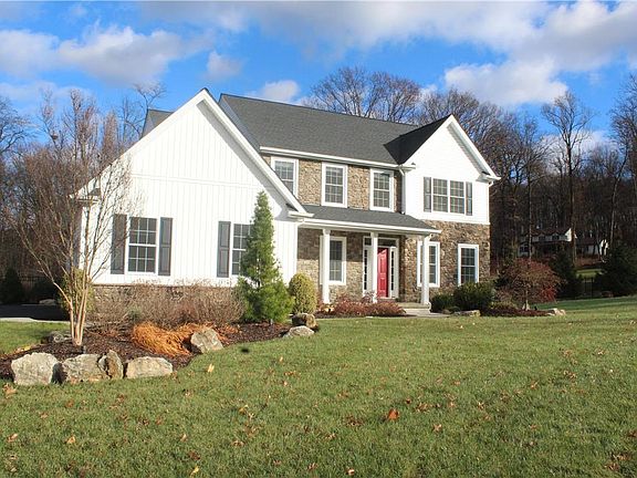 Two Story Farmhouse with Eldorado stone veneer & vinyl siding, on a quiet street sitting on .93 Acre lot, in Lower Saucon's Pleasant Hills Subdivision. Many upgrades & improvements throughout the interior & exterior of the home makes this 3770 sq.ft home roomy enough for all family sizes. Five bedrooms, three & half bathrooms, nine Foot ceiling on the first floor & lower level, eight foot ceilings on the second floor. The finished lower level offers a fifth bedroom/flex room, full bathroom with custom tiled shower, living area and full egress window. Additional features include; 5 1/4 base molding, 3 1/2 casings for windows & doors, scissor staircase with hardwood treads and landing, stained oak hardwood flooring, wide crown moldings, picture frame molding, two piece chair rail, 15 lite French door in the living/Office room, Stainless steel appliances, shaker style cabinets, walk in pantry, granite countertops, tumbled tiled marble back splash, 5 burner propane stove, propane fire place, 2nd floor laundry, new LVT flooring throughout the 2nd floor, Grand master suite with custom 8x6 tiled shower, ample closet space in all the bedroom three 3 car garage, private fenced yard, rear paver patio with gas fire pit, custom landscape. The extended driveway offers additional off street parking, while the sun filled covered front porch offers a retreat for warm days & cool nights to pass the time. Truly a hidden retreat. Close to all major interchange routes, shopping and nightlife.