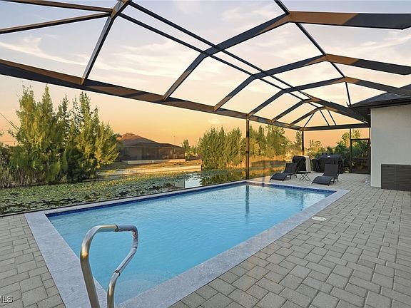 Experience modern Florida living in this stunning, light-filled waterfront pool home situated on a wide freshwater canal. With 4 bedrooms, 3 bathrooms, a seawall, and an extended screened patio overlooking the sparkling pool, this home offers exceptional value—all at an incredible price and NOT in a flood zone. Step inside to discover high-end finishes throughout, including 8 ft doors, impact windows, and luxurious 32x32 porcelain tile flooring. The chef-inspired kitchen is truly the heart of the home, featuring sleek acrylic cabinetry, a dramatic waterfall quartz island, quartz counters, custom tile backsplash, modern vent hood, and premium appliances. All three bathrooms are beautifully appointed with quartz counters, frameless glass doors, and sophisticated tilework. Even the window sills are quartz—no detail was overlooked. The outdoor living area is an entertainer’s dream. Enjoy an oversized screened pool and cage with elegant picture-frame panoramic no seeum screens, a spacious lounge area, color-changing lighting, and an outdoor bar with drink cooler and serving station. The pool features a heater/chiller perfect for those FL summers, a full-width bench seat perfect for relaxing and socializing. Home is prepped and ready with electrical for generator. The freshwater canal with seawall offers wide-water views from every angle. Located on a quiet street with mostly newer homes and minimal traffic, this home puts convenience at your fingertips. Publix, the new Aldi, Lowe’s, Target, Walmart, plethora of restaurants to choose from are all just minutes away. A fantastic neighborhood park—complete with pickleball, tennis, a fenced playground, a kids’ zipline, and walking trails—is less than a mile away. Plus, you’re only a short drive to downtown Fort Myers, where restaurants, entertainment, and riverfront charm await. This is the whole package—style, location, upgrades, and value. It doesn’t get better than this!