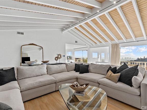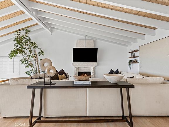The open-concept floor plan features beamed ceilings, hardwood floors, recessed lighting, and a cozy fireplace. A chef's kitchen with stone countertops, waterfall island, stylish cabinetry, and new Viking appliances flows seamlessly into the dining and living areas, with balconies off both kitchen and living room. Floor-to-ceiling windows and sliding glass doors flood the home with natural light, opening to two terraces on the main level for true indoor-outdoor living. The spacious primary suite offers a private terrace, walk-in closet, and spa-style bath with shower, jacuzzi tub, and double vanity. Two guest bedrooms plus a gym add comfort and flexibility. Additional highlights include an attached two-car garage, washer/dryer in laundry space, and smart home technology. Just minutes from world-class dining, shopping, and entertainment, this estate delivers both tranquility and convenience.