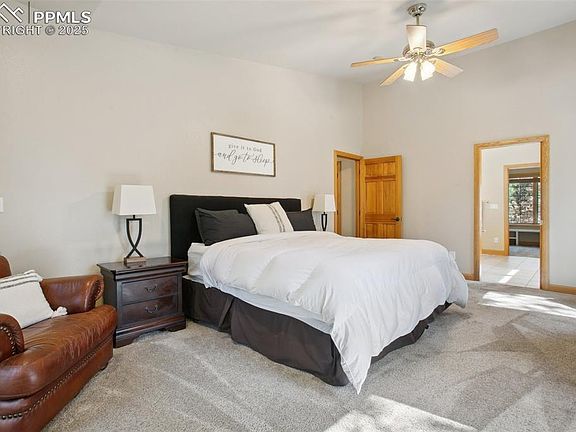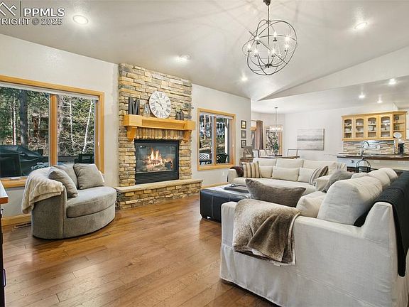 Nestled on a private, wooded cul-de-sac in the sought-after Woodmoor neighborhood, this custom 5-bedroom, 4-bathroom ranch home offers true Colorado living with convenient main-level functionality and plenty of peace and quiet. The main level boasts a Master Suite with a spacious bathroom and a serene treehouse view from the many windows overlooking the water feature and easy access to the backyard deck. A spacious main level office/bedroom includes a convenient pull-down queen-size Murphy bed for guests, perfect for grandparents. You'll also find a full guest bathroom, a formal dining room, laundry, mudroom, kitchen dining area and a family room featuring a stone gas fireplace and updated light fixtures. The recently updated custom kitchen boasts a large island with seating for seven, ideal for family gatherings and entertaining. The bright, walk-out basement with 10-foot ceilings and above-ground windows includes a custom wet bar, three large bedrooms (including a mother-in-law suite) with large walk-in closets and shelving, two full bathrooms, and a living area with a gas fireplace. Outside, low-maintenance professional landscaping, including a flagstone patio with a waterfall and pond accessible from the lower level, a large redwood deck with a gas grill hookup on the main level, mature Blue Spruce and Ponderosa Pine trees for privacy, two lawn areas, and a complete sprinkler and drip system, all designed to blend with the natural Colorado environment. The spacious 3-car attached garage includes shelving, a side yard door, and natural light. Additional highlights include a low-maintenance stucco exterior, Pella windows and sliding glass doors, solid wood doors throughout, and dual hot water heaters. Experience secluded small-town living with easy access to I-25, the Air Force Academy, The Country Club at Woodmoor, Colorado Springs, and the Denver Tech Center.