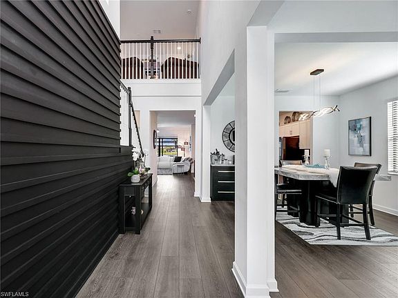 Stunning CUSTOM POOL HOME CENTER LAKE in the #1 selling community in Southwest Florida!! This desirable two-story lakefront home boasts over $200,000 in custom upgrades icluding a grandfathered in 12' extended roof over the lanai!! Boasting 5 spacious bedrooms with a 1st floor bedroom, 3 full bathrooms, a den, a loft/media room with french doors, a 3-car garage and over 3,200 square feet of living space in this highly upgraded home! With its refined finishes, functional layout, and beautiful lakefront setting, this home perfectly blends luxury and comfort for everyday living and entertaining. As you arrive, the 6-car driveway is presents the well-manicured landscaped exterior showcasing the dramatic two-story entrance! Step through the front door and you're welcomed by an elegant foyer with a custom accent wall, setting a tone of sophistication that carries throughout the home. Just off the entry, the den offers a warm and inviting retreat or home office space, a two-tier staircase with a sitting area and entrance to the upstairs loft. The heart of the home is the open-concept kitchen and great room, where a completely redesigned oversized kitchen island elevates the style with glass backsplash and accent tile around the island. The kitchen features sleek quartz countertops, black stainless steel appliances, upgraded cabinetry, and a stunning designer glass blacksplash that adds just the right amount of sparkle. A large walk-in pantry ensures everything has its place with ample storage area throughout. The kitchen flows effortlessly into the spacious dining and living areas, perfect for hosting family and friends. The family room features a custom TV wall and tons of natural lighting with views of the lanai, pool and lake. The 1st floor bedroom offers a full bathroom and privacy for shared family living or guests. Upstairs, you'll find a large bonus living area offering flexible space for a media room, game room, playroom, or additional lounge along with the primary suite, 3 guest bedrooms, and a guest bathroom. The layout provides separation and privacy between the upstairs and downstairs bedroom, making it ideal for multi-generational living or accommodating guests. The primary suite is a true retreat with views of the lake and beautiful natural lighting. The master bath features dual vanities, a separate soaking tub, walk-in shower, linen closet, and two walk-in closets. Secondary bedrooms are generously sized, and all bathrooms are finished with upscale quartz counter tops that complement the home’s clean, modern aesthetic. Step outside to the show-stopping outdoor retreat with an expansive pool deck enclosed by a panoramic screen that perfectly frames the serene lake views beyond. The outdoor space features a custom built saltwater pool with gorgeous tiling, offering gorgeous views of the sunset. Enjoy the outdoor living room with two TVs, a hot tub, dining table, lounge chairs, and more!! Life in Verdana Village is like a vacation everyday!