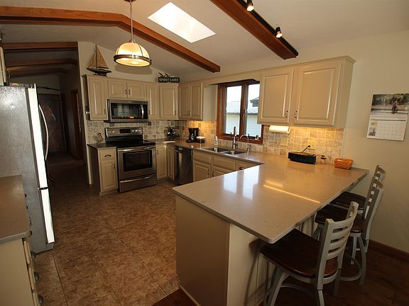 Wonderfully updated family home on quiet Pioneer Beach on the quiet portion of East Lake Okoboji. With 52' of low bank lakeshore and 65' of roadside width, this 1/4 acre lot affords privacy, gardening, and space to play croquet/volleyball/yard games. New wood flooring in the living areas, all Anderson brand windows, Quartz countertops in the kitchen, band new lakeside deck, and new exterior maintenance free siding, this home is in excellent repair. Dickinson County trail right across the road too. This home is easy to love, and it has a flat, no steps walk out to the lake. Great value in a lakeside home with close to everything location.