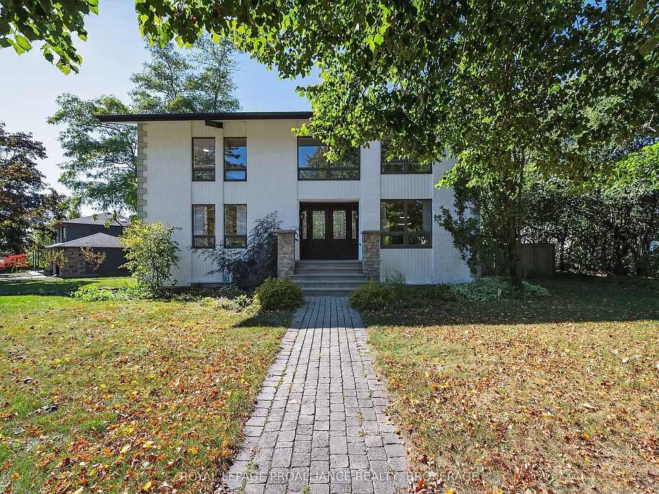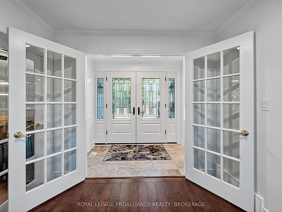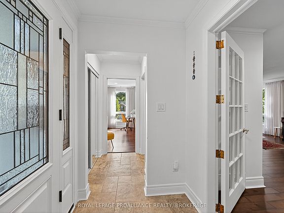 Located in Kingston's prestigious Alwington Place, this stately 5-bedroom, 3.5-bath home sits on a beautifully landscaped corner lot, offering timeless charm in a highly desirable setting. Ownership includes privileges in the Alwington Place community, granting exclusive access to a private waterfront park and beach mere steps from the property. Inside, grand double doors open to a welcoming foyer with coat closet and powder room, leading to a bright den - perfect for a home office or quiet retreat. The living room exudes sophistication, while the formal dining room showcases crown moulding and a ceiling medallion. The eat-in chefs kitchen features granite countertops, double wall oven, stainless steel appliances, and walk-out to a serene backyard retreat. Upstairs, the spacious primary suite includes a sitting area, walk-through closet, and 3-piece ensuite with glassed-in rainfall shower. Four additional bedrooms and a 4-piece bath complete the upper level. The finished lower level offers exceptional flexibility with a large family room featuring an electric fireplace, a full bath, laundry area, wet bar, and ample space for a gym, playroom, or guest suite. Direct access to the double-car garage with inside entry adds convenience and functionality. Outside, enjoy a private backyard oasis with a stone patio shaded by mature trees, lush lawn, and garden bed. This exceptional location is just minutes from Portsmouth Olympic Harbour, Isabel Bader Centre, Queens University, and downtown Kingston's vibrant shops, restaurants, and entertainment.