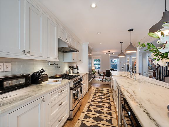 Garden Level: Enter into an open living/dining space featuring an intimate dining area perfect for entertaining, a chef's kitchen outfitted with an expansive island made from Vermont Danby marble, a professional Blue Star range, and Liebherr appliances, plus a luxurious living area complete with powder room. The rear glass wall features massive glass doors looking out onto the garden, bringing the outside in and bathing the area in natural light.