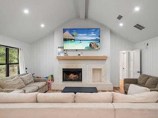 New metal roofQuartz countertopsVaulted and tray ceilingsMaster suiteMarble finishesOutdoor firepitWood-burning fireplace
