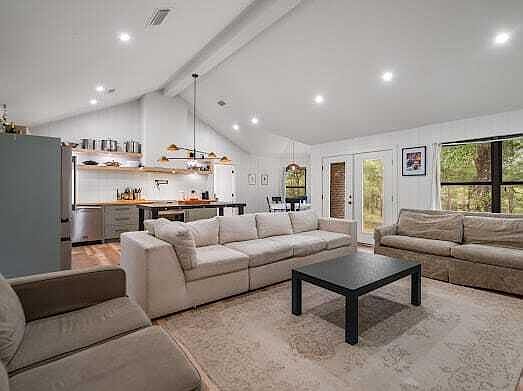 Step into luxury with this stunning 4-bedroom, 2-bath Ranch home, where quality craftsmanship meets modern comfort. Sitting on 4.05 acres, this beauty is featuring foam insulation and a new metal roof. The residence is built for efficiency and durability. The chef's kitchen is a culinary masterpiece, outfitted with commercial-grade appliances, a farmhouse sink, oak wood countertops, and soft-close cabinets. Solid pine shelving adds warmth and character, while luxury vinyl flooring throughout ensures both style and practicality. Retreat to the spa-like bathrooms, where quartz countertops and marble finishes set the scene for relaxation. The master suite boasts a double vanity and elegant detailing, making it a true sanctuary. Enjoy cozy nights by the wood-burning fireplace or host gatherings around the outdoor firepit. Recessed lighting, vaulted and tray ceilings add sophistication, while the breakfast area invites intimate moments to start the day right.
