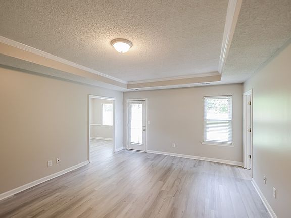Step inside to find fresh, neutral interiors and an inviting open-concept layout. The living room features elegant tray ceilings and LVP flooring that extends throughout, creating a cohesive flow between spaces. The adjacent dining area and kitchen offer plenty of cabinet storage, double sinks, and access to the laundry room and backyard patio, a great spot for morning coffee or evening relaxation.