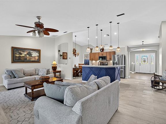DEEP CREEK! This 3-BEDROOM, 2-BATH, 2-CAR GARAGE POOL HOME ON QUIET CUL-DE-SAC IN HIGHLY SOUGHT AFTER COMMUNITY WITH NEWER 2023 ROOF! Open, split floor plan features high ceilings, updated interior lighting, custom plantation shutters, and new flooring through most of house. Updated kitchen offers all wood cabinetry, complimented by quartz countertops, tile backsplash, new stainless-steel appliances and island perfect for entertaining. Both casual and formal dining and living spaces provide great space for family gatherings. Spacious primary bedroom features natural light from window overlooking lanai/pool area, walk-in closet, and private ensuite bath. This split bedroom floor plan ensures ultimate privacy for guests. Good size two additional bedrooms with own hall and shared full bath. Step outside to your own private retreat! The outdoor area features a covered lanai with a screened heated, saltwater pool and mature landscaping. This home provides an excellent setting for outdoor entertaining or simply unwinding in your serene surroundings. Additional highlights includes new hot water heater 2024, impact windows and impact slider door, fenced in yard, and enclosure on side of house. Great location in a quiet and friendly neighborhood conveniently located close to I-75, restaurants, shopping, schools, parks, golf and just a short drive to downtown historic Punta Gorda, known for its world-class fishing and boating, community events and entertainment. Don’t miss this opportunity! Schedule your private showing today!