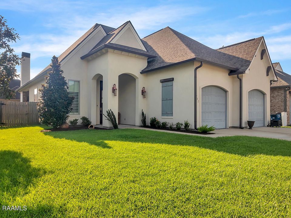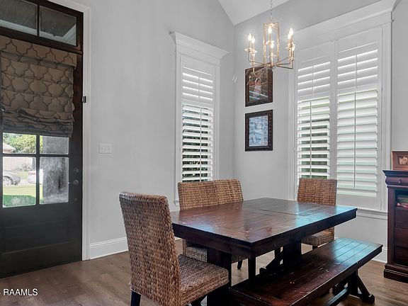 See this lovely Country French style home nestled in the beautiful quaint Cypress Gardens Sub division. Enter the home to view the abundance of high end amenities including designer lighting fixtures, wood beam features, cathedral and 12 ft ceilings, wood plank floors in living areas and bedrooms, Plantation shutters, custom fireplace, french doors and more. The home features a split floorplan with a very spacious open Kitchen-dining-living area, large laundry room, computer nook and drop zone. The kitchen has a large island with dine in seating, stainless appliances, an abundance of cabinets and walk-in pantry. The primary suite offers a lovely spa like bath with dual vanities and sinks, soaker tub, tile and stone encased walk in shower and Huge wallk in closet that opens to the laundry room. Outside, there is a nice covered patio with woodburning fireplace, built in bar-b-que pit, sink and storage perfect for outdoor entertainment. Also, the subdivision features a wonderful community pool for your summertime fun! This home is conveniently located near all of Youngsville's growing businesses, schools, restaurants, sports venues, etc. and is ready for its new owners. You won't want to miss this charming home filled with character, so make your appointment to see it soon!