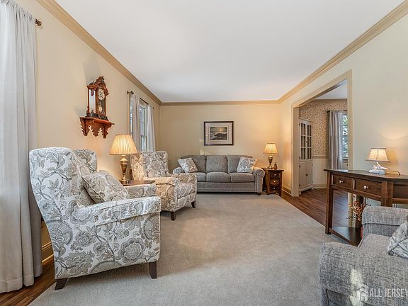 Set high within a secluded enclave surrounded by the natural beauty of the Sourland mountains. Warm neutral tones flow through-out this timeless and comfortable home, harmonizing beautifully with the natural wooded landscape and extensive hardscape. Sweeping views, offering miles of scenery are captured from every bedroom. The well-appointed kitchen exudes warmth with rich wood cabinetry and earth-tone granite countertops complimented by a suite of LG stainless steel appliances. A serving buffet opens to the family room, creating an ideal setup for entertaining. Kitchen slider opens to the exceptional outdoor living spaceperfect for open-air dining on the large, lighted deck or patio surrounded by rock walls and a tree lined backdrop that ensures com-plete privacy. Wide crown moulding and built-in cabinets highlight the living, dining and family rooms. Upstairs, the primary suite features crown moulding, a large closet and ensuite bath with a wood vanity, built-in linen cabinet and shower in tile surround. Three additional bedrooms and a hall bath complete this level. Neutral carpet is found in all bedrooms with ceramic tile floors in all baths. The finished lower level expands the living space with versatile rooms for recreation, remote work, and laundry equipped with an Electrolux washer and dryer. Generous storage is found throughout, including a loft area above the two-car garage. Recent updates include HWH 2023, HVAC 2019. Public Water and Sewer. Centrally located with easy access to Major Highways, Rail and Bus to NYC, Shopping and Restaurants, Award Winning Hillsborough Township Schools.