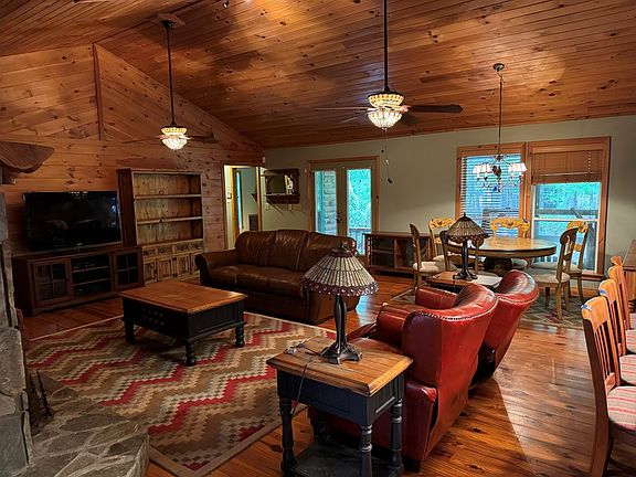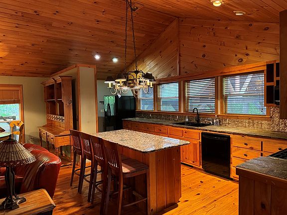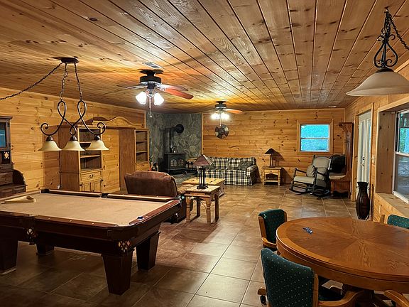 OPPORTUNITY<>Fightingtown Creek Cabin on 2.2 acres level terrain with large 2 car attached carport, large great room with custom rock fireplace, wood burning stove in basement, large game room, basement kitchenette, tons of storage, large master bedroom with walk-in closet, water feature in the front yard, wood and tile flooring, large open backyard to creek, shed and lots of decking.Separate basement section off laundry room for inlaw suite. AS-IS sale no disclosures. Trustee must approve.