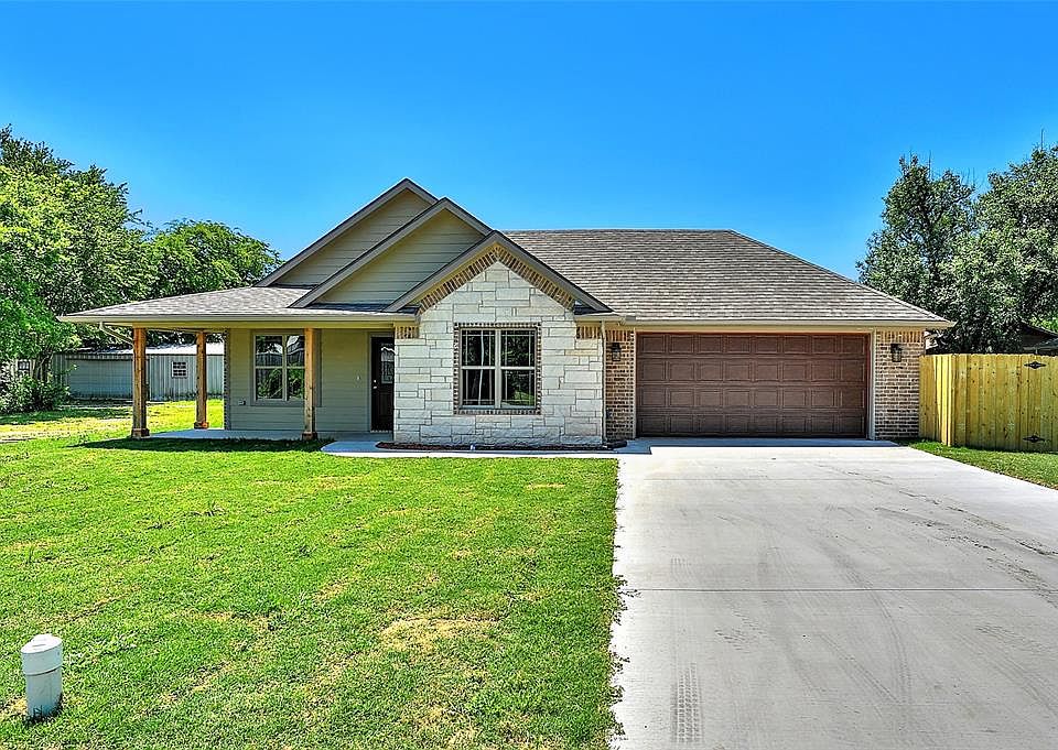 Beautiful new Construction in Tom Bean 100% complete and move in ready. This home has lots of curb appeal with a covered front porch and stone accents. Step into the open floor plan to find a spacious living area that flows into the the eat-in kitchen with a breakfast bar, granite counter-tops, walk-in pantry and stainless appliances. Other features include a full size utility room with cabinets and a pocket door, designer lighting, ceramic tile and stylish vinyl plank flooring that is 100% waterproof. This energy efficient home has radiant barrier, 16 seer HVAC, piered slab, and insulated garage. Entertain on the large patio or just enjoy the large backyard with wood privacy fence.