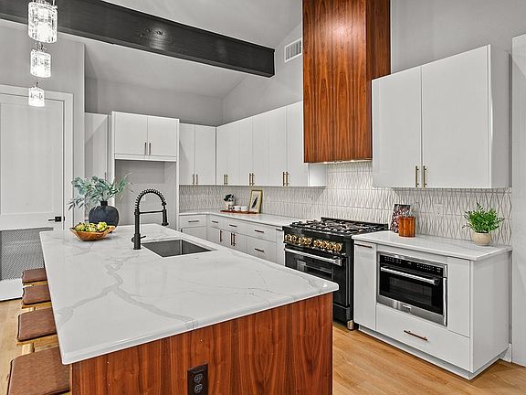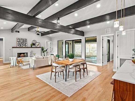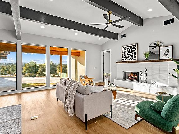 This Eichler inspired single-story mid century home captures true indoor-outdoor living with clean architectural lines, walls of glass, and designer finishes. The 2,667 sq ft main home offers three bedrooms with their own ensuite bathrooms, an office, and a second living area, while a 528 sq ft detached casita on the hill behind it includes its own kitchen/living space, bedroom, and full bath which is ideal for guests, a creative studio, or future pool house. The open layout with beamed ceilings, and light oak colored LVP connects a great room with fireplace to a beautiful kitchen featuring quartz countertops, a large island with bar seating, ZLine gas range, and huge walk-in pantry. Natural light floods the space through expansive windows on two sides, highlighting designer tile, and a seamless flow between living, dining, and outdoor areas with three separate sliders. The primary suite features large windows, private patio access, and a spa-style bath with soaking tub, glass shower, dual vanities, and walk-in closet. Each secondary bedroom includes a private ensuite bath. A covered back patio opens to a small yard with stairs leading to the upper yard and casita. The cul-de-sac lot offers privacy, and the casita’s fenced gate opens onto Caliterra’s walking path. From its hilltop porch and guest house living room, enjoy Hill Country sunset views framed through the oaks. Additional highlights include a three-car detached garage with breezeway and a mudroom with drop zone. Residents enjoy resort-style amenities: clubhouse, pool, Sonder Coffee shop, parks, and miles of trails along Onion Creek—all near top-rated Dripping Springs ISD schools. Call today to schedule your tour of this unique home!
