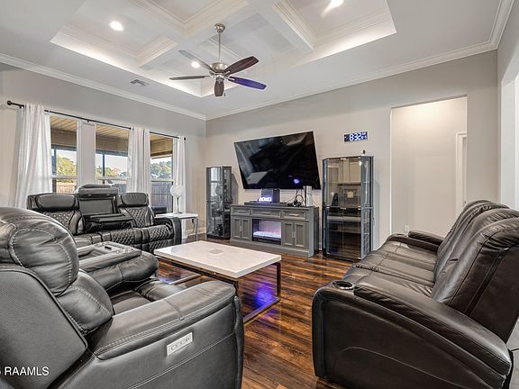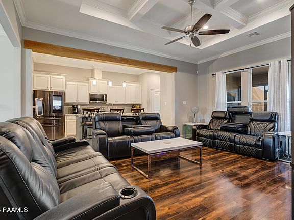 White painted stuccoCoffered ceilingLarge backyardCustom cabinetryTiled showerOpen split floor planStylish backsplash