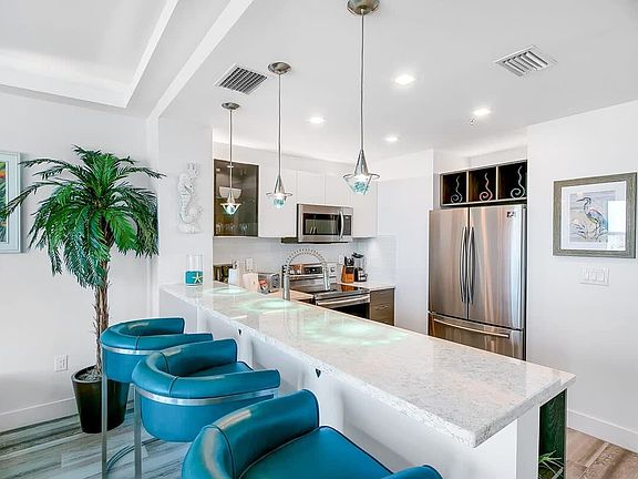 Prepare meals in the fully equipped kitchen, complete with modern appliances, ample counter space, and pantry storage. Dine indoors or step out onto the private balcony to savor breathtaking views of the canal, vibrant sunrises, and, if you're lucky, a spectacular rocket launch from the Space Coast.