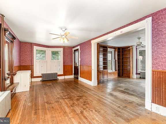 Privacy fenceBrick fence yardRadiator heatAntique serve through cabinetsAntique built-in wall mirrorWood mantleWrap open faced porch