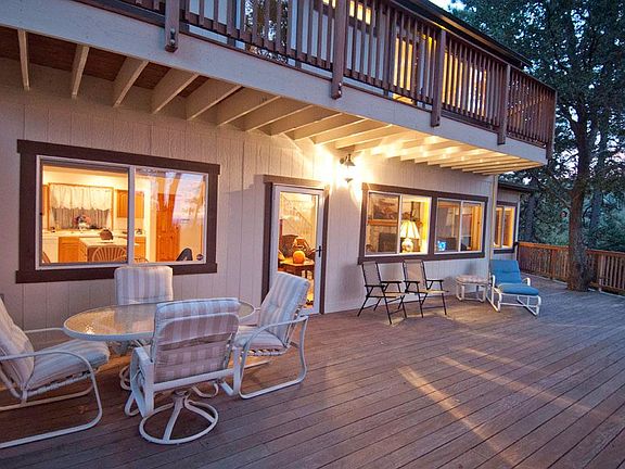 An Executive Home in the prestigious Mile High Park area of Crestline. This home is next to the National Forest with views of the High Desert and mountains. The home has two-stories, an attached 2-car garage, a gardening shed with water hookups, and a long driveway. The first floor includes the kitchen/dining/living room with fireplace and bath, plus the downstairs master bedroom with whirlpool bath and sauna. Upstairs includes the 2nd master bedroom and two smaller bedrooms and a full bath. The total square-footage of the home is about 2,000 square feet. The decking at the front of the house includes three levels of teak decking and railings covering the 1st and 2nd stories of the house plus the lower courtyard in front of the house. The home will be rented unfurnished. Renter is responsible for gas, electric and water. The first and last months rent is due at signing. Up to two small pets are permitted. No smoking allowed inside the home.
