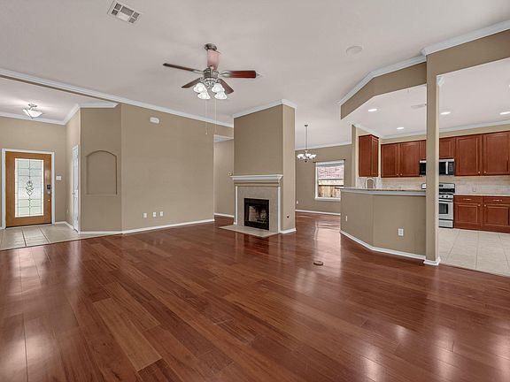 Beautiful Single-Story All-Brick home in Forest Oaks – Walk to All Schools! Welcome to this beautifully maintained home nestled in the desirable Forest Oaks community. This elegant residence features a welcoming stone patio entry and stunning glass front door, setting the tone for the warmth and character found throughout. Step inside to discover Brazilian hardwood floors and tall ceilings with crown molding. A centrally positioned fireplace anchors the living room, creating a warm focal point that separates spaces while keeping the open flow. The open-concept kitchen is a chef’s dream, offering granite countertops, stainless steel appliances, recessed lighting, cherry cabinetry with pull-out shelves, and a convenient breakfast bar overlooking the living room. Enjoy both formal and casual dining with a dedicated dining room and a charming breakfast nook. The private primary suite boasts tall ceilings, a ceiling fan, and a luxurious en-suite bathroom complete with a double vanity, garden soaking tub, separate shower, and a large walk-in closet. Three additional bedrooms offer flexibility for family, guests, or home office needs—the fourth bedroom is ideal as a study or workspace. A second full bathroom features stylish designer tile. The backyard is a true favorite—shaded by majestic oaks with a covered patio and spacious deck made for relaxing evenings and weekend gatherings. Hot tub conveys! Additional highlights include an attached 2-car garage, and water softener system. Enjoy Forest Oaks’ top-tier amenities including two pools (one with a waterslide, the other a junior Olympic lap pool), a clubhouse, 2.5-mile hike and bike trail, basketball court, playgrounds, and year-round community events. All this in an unbeatable Cedar Park location—walk to the elementary, middle, and high schools, and enjoy close proximity to shopping, dining, and major employers. Don’t miss your chance to own this exceptional home—schedule your private showing today!