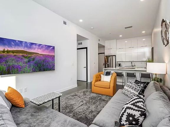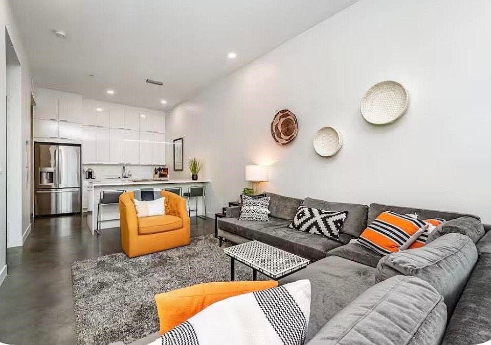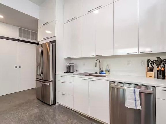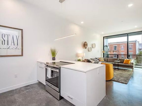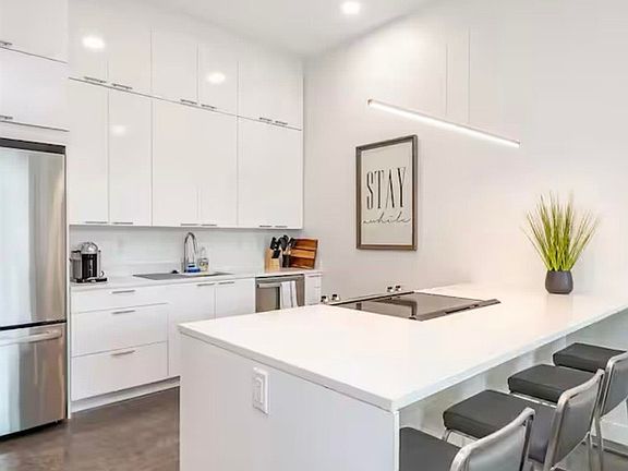 Modern kitchenPatio overlooking linn streetFloor to ceiling windowsBlack out shadesIn-unit laundry