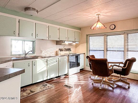 Amazing home on it's own island in a cul-de-sac in popular 55+ community is available for immediate possession! Enjoy this spacious lot with large screen room, 11' X 17' double door workshop (electric/bench/overhead lighting and window), full length pass-through carport with shading mesquite trees plus a variety of cacti. Front eat-in kitchen has large front bay windows, ample counter & storage including a built-in desk & pantry. Generous built-in storage throughout. Seller list of improvements incl. waterproof laminate floor covering, walk-in shower (removable seat), top/bottom adjustable blinds in primary bedroom, and more. Base lot rent is $614 (plus utilities/tax). Community offers heated pool, hot tub, planned activities. Cash sale offers only. Pets okay (some restrictions apply).