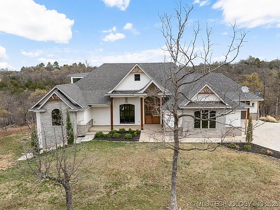 windows that create a bright and airy atmosphere. The home features gorgeous wood floors throughout. A striking brick wall in the living area, entryway and master bedroom creates a lasting impression. The kitchen is appointed with custom built-in cabinets, soft-close drawers and professional-grade appliances. A spacious quartz island provides the perfect setting for food preparation while socializing with guests. An adjacent outside bar area offers additional opportunities for entertainment. The expansive master bedroom boasts a cozy fireplace. The master bathroom is a serene retreat, complete with a large walk-in closet and a built in safe. It isn't until you walk downstairs that you see all the square feet this home truly has. Downstairs features additional living space, four bedrooms and two bathrooms. A kitchenette, safe room, and utility room with a dog wash/grooming station are also included. There are two laundry rooms, one upstairs and one downstairs with plenty of storage and space. The residence features instant hot water system, built in de-humidifier, electronic air filters, surround sound and security cameras. The three-vehicle garage is insulated, as is the attic. Upon stepping outside, you can take pleasure in the 7.1 m/l acres and the fenced, raised garden beds ideal for gardening. This property is conveniently situated between Tulsa and Stillwater. This exceptional residence offers numerous details that warrant a personal viewing.