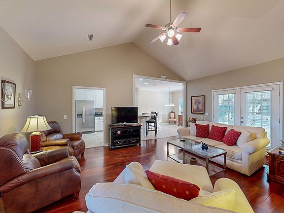 This one owner pristine 3/2 offering approximately 1750 ft. of heated and cooled living area has much to offer. Upon arrival at the brick craftsman-style residence, guests are greeted by a covered entryway. Entry opens into a true foyer, revealing the arched living room with French doors on the rear leading to the covered back patio overlooking your private fenced in spacious yard. Floors from the foyer through the main living room and hallway shine with the engineered Honey hardwood flooring. Tile flooring through the kitchen / dining area as well as both bathrooms. The kitchen/dining room combo allows plenty of seating for family or entertainment. Raised countertop offers seating for up to four barstools. The laundry room/pantry is located between kitchen and garage. Master ensuite boasts additional office/nursery Ensuite features soaking tub, tiled shower, twin vanities & large closet for plenty of storage. Newly installed carpet in all bedrooms. Roof installed 08/25, HVAC installed 2021 (still under warranty until Jan. 2027). The property is conveniently situated within a short walking distance of the 400 acres of walking trails at Forever Wild Trails.