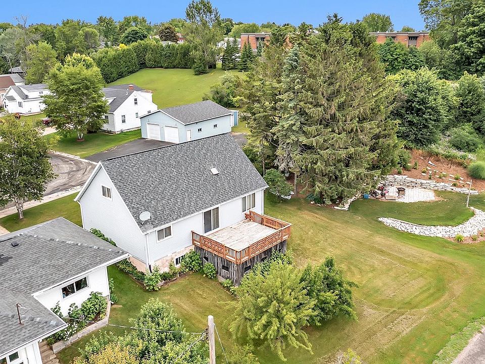 Spacious 2 story home w/walk-out lower level on 2 parcels totaling .65 acres within walking distance to Marina, Lake Michigan, Crescent Beach & Boardwalk & Algoma Lighthouse. Open concept living room w/doors to deck w/built-in seating. Applianced kitchen w/snack counter & adjoining dining area. 1st floor laundry + hook-ups in LL. Main level master w/deep walk-in closet & adjoining full bath w/separate step-in shower. Upper level boasts an oversized bedroom + separate bonus room. Updates include: Upper level addition, new electrical, plumbing & 100 amp service. 3+ car detached garage w/workshop area. 1 Car detached garage on back of 3 car w/electric & overhead door. 14x15 enclosed storage space under deck w/LL access. Also parcel #201-00360-0620.
