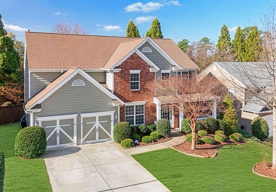 Tucked just within the well kept Madison Falls community, this five bedroom, three bath home offers open functional space along with private areas designed for a wide range of needs. The main level features a full guest suite, a study with built ins, and an open great room with charming fireside living areas. Upstairs, the oversized primary suite includes a spacious flex space and a custom closet, with high ceilings and well proportioned secondary bedrooms adding comfort throughout. The yard is low maintenance, and the community pool and playground are a short distance from the front door. With quick access to I 575, Peach Pass lanes, GA 400, Downtown Woodstock, East Cobb, and Roswell, this home brings space, convenience, and a prime location together.