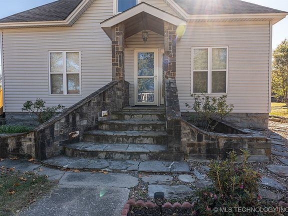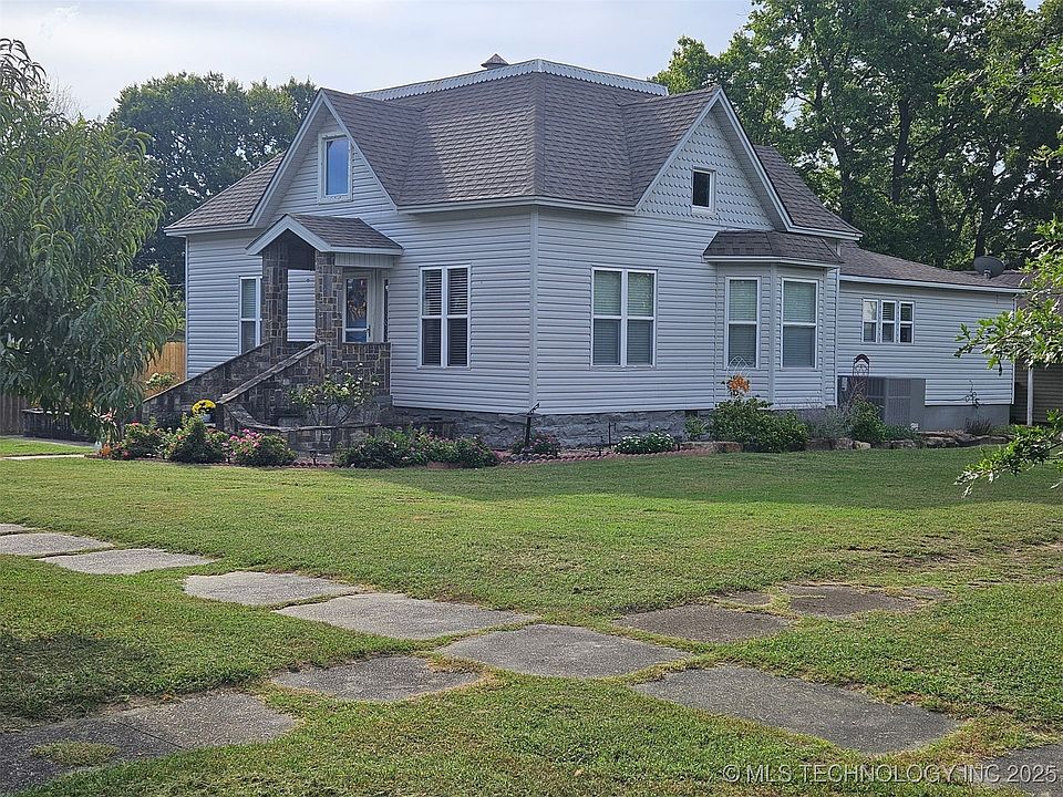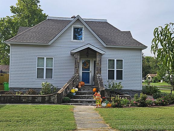 This beautifully updated three-bedroom, two-bath home is full of character, charm, and thoughtful improvements throughout. The inviting entryway is highlighted by unique standing rockwork equipped with lights that adds warmth, personality, and curb appeal the moment you arrive. The flower beds are established with many perennial plants and flowers. There are also several fruit trees planted around the property including one cherry and two peach. Inside, the main level offers 2 bedrooms, 2 bath with central heat and air, stunning refinished hardwood floors, 9' tall ceilings, and gorgeous crown molding and woodworking that showcase the home’s classic appeal. The ceiling in main living room is a must-see with remarkable detail and design. The upstairs features a spacious bedroom with abundant closet space and its own Lennox mini-split for customized heat and air comfort, dedicated to the upper level. The kitchen is generously-sized and features a large walk-in pantry, a newer kitchen stove, and a newer Bosch dishwasher. Both bathrooms have been updated, and the home has fresh interior paint, making it truly move-in ready. Outside, the fully fenced backyard includes a nice privacy fence and a beautiful new pergola equipped with electricity and a ceiling fan—perfect for outdoor entertaining or relaxing evenings. Additional exterior perks include a two car carport, extra rear parking, and a storage building with electric. Roof was new in 2018. Modern upgrades such as some PEX plumbing, newer electrical, newer 50 gallon hot water tank, and two and half year old HVAC unit are some of the many additional enhancements that make this home a perfect blend of historic charm and contemporary comfort. Centrally located between Tulsa and Oklahoma City, easy access to Interstate 40 for the commuter.