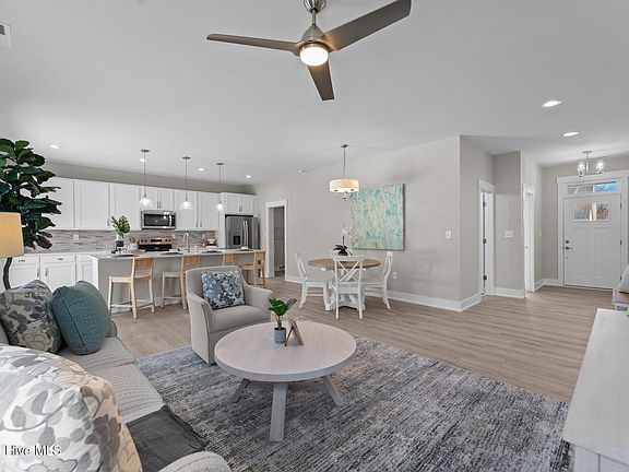 This is your chance to own a MODEL HOME! Discover the Whitestone Model in the gated community of Waterside Villages! This thoughtfullydesigned 3-bedroom, 2-bathroom single-level home maximizes every square foot with an open floor plan, vaulted ceilings in the great room anddining area, and a spacious kitchen featuring a large island —perfect for entertaining. The owner's retreat offers a luxurious ensuite with a walk-in closet and dual sink vanity. Enjoy the coastal breezes on the private, covered back porch while staying organized with an attached, exteriorstorage area. Luxury touches include durable luxury vinyl tile (LVT) flooring in main living areas, granite countertops, upgraded cabinetry,stainless steel appliances, washer and dryer, tile flooring in full baths, craftsman-style trim throughout, and designer lighting fixtures. WatersideVillages is a master planned, gated community with amenities that include clubhouse, swimming pool, basketball court, pier, shallow watermarina, and picnic pavilion. Located 12 miles from the OBX beaches, Waterside Villages is in the heart of Grandy and near three public golfcourses and only minutes to local shopping and restaurants. Buyer to pay one-time capital contribution fee of $975.00 at closing. Home isprofessionally staged and furniture, furnishings and decor do not convey.