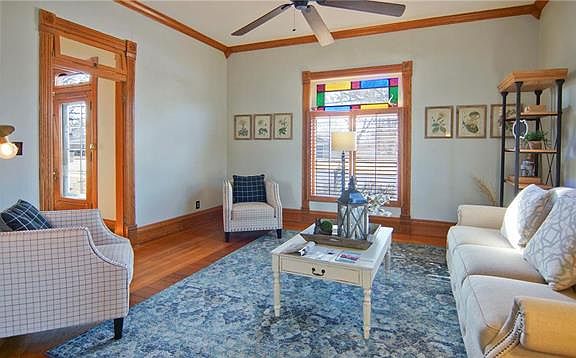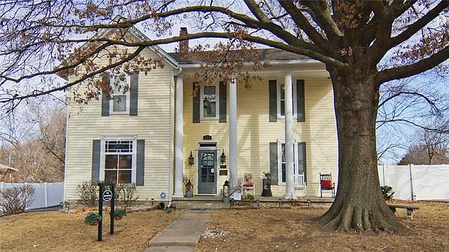 Historical Downtown Lee's Summit home boasts of old world charm w/modern updates! Also known as "The Browning Mansion", this farm-house style home is full of character. Gleaming hardwood & knotty pine flooring thru-out! Formal dining & living rms. First floor master w/stone FP and separate full bathroom w/claw foot tub! Kitchen with bar & breakfast room. Inviting sunroom, wrap around deck w/Pergola, & courtyard make this a perfect place for outdoor entertaining! Expansive front porch w/porcelain-front columns.
