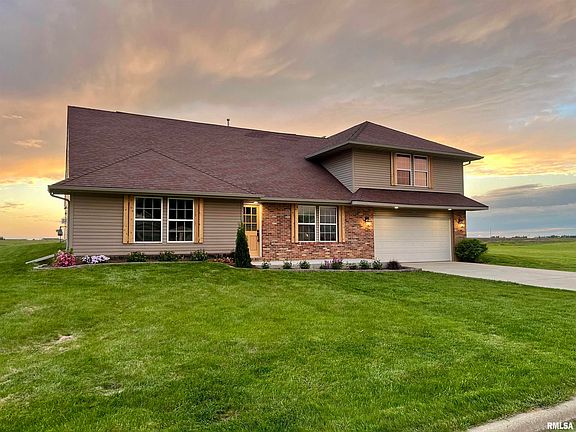 Location is key for this 4 bed 3.5 bath home nestled on a quiet street in the city limits of Goodfield, and close to the park. From the cul-de-sac street to the open fields, this home combines country living views with town amenities. Built in 2010, this home has been fully updated and is move in ready. Vaulted ceilings, a fireplace and custom crafted wood beams are beautiful custom features of the open concept living area. The kitchen boasts concrete hard surface tops, a large island with seating, coffee bar area, and a butlers pantry with garage access. The main level features a primary suite with a private bath as well as another bedroom that could also be a great home office. Upstairs you will find another primary suite, complete with sunset views and a luxurious bathroom/closet. Complete with double head shower, soaker tub, double vanities with concrete tops, and french door walk thru closet, this en suite is sure to impress. Down the hall you will find an additional bedroom with 2 walk in closets, as well as another full bath. A large 21'x15' bonus room that could be a bedroom offers a lot of options. The appliances are all brand new thru out the house including the laundry machines. The laundry room/mudroom is right off the garage which is 2 cars wide and 2 cars deep on one side making it a tandem 3 car or a place for storage. Out back, a freshly poured concrete pad faces the west and an open field. A small shed is also included. Agent owned.
