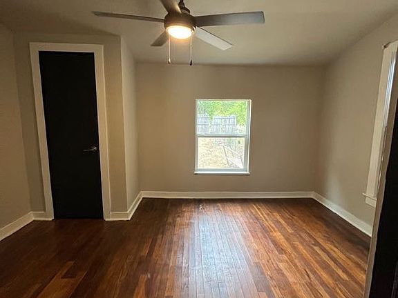 The spacious bedroom includes original hardwood floors that lend character to the room, complemented by a ceiling fan for added comfort. The room is versatile, offering space for your personal touch and furniture.