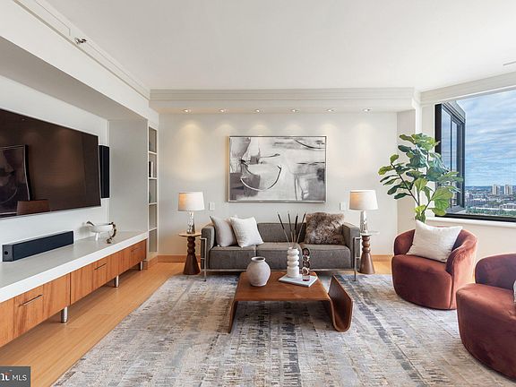 Experience the height of sophisticated city living at The Rittenhouse Condominium, where this stunning custom residence enjoys expansive northwestern views that captures golden hour light. Perfectly situated on one of the building’s most desirable tiers, this beautifully renovated home is a rare double-unit combination that seamlessly blends architectural elegance with state-of-the-art smart-home technology—all within one of Philadelphia’s most prestigious full-service addresses. From the moment you enter, you’re welcomed by an expansive, light-filled living space framed by wide windows that bring in panoramic views and glowing sunsets. The thoughtfully reimagined interior reflects a designer’s touch at every turn, with 6” wide bamboo flooring, curated lighting to highlight artwork, and custom automated window treatments—all managed via integrated iPad technology, which also controls HVAC, lighting, and media throughout the home. The open-concept living and dining areas offer an ideal layout for both entertaining and relaxed everyday living. A built-in maple banquette anchors the dining space, complete with a bespoke glass table and chairs. The adjacent chef’s kitchen features stainless steel appliances by Dacor, Bosch, and KitchenAid, granite countertops, maple cabinetry, and a breakfast bar perfect for casual dining. A stylish powder room with marble vanity and an ASKO washer/dryer adds convenience, while a temperature-controlled wine closet offers a curated touch for collectors and entertainers alike. Originally configured as a three-bedroom home, the residence has been reimagined with two expansive suites, enhancing the sense of openness and flow. The secondary bedroom currently serves as a flexible den or office with custom built-ins and generous storage. The third bedroom—now open to the living area—can easily be enclosed again to suit your needs. The primary suite is a tranquil retreat, featuring a generous custom 9' x 12' walk-in closet and a spa-inspired en-suite bath clad in Jerusalem limestone and Carrara marble. A frameless glass steam shower with rain shower head and multi-jet fixtures completes this luxurious space. Life at The Rittenhouse offers a rare combination of luxury, privacy, and world-class service. Residents enjoy 24-hour concierge and doorman services, secure valet parking, and the benefits of a meticulously managed building. For an additional cost, indulge in access to The Rittenhouse Hotel’s premier amenities—including the fitness center, indoor pool, full-service spa, and five-star services like room service, housekeeping, laundry, and exclusive dining privileges at Lacroix, Scarpetta, and The Library Bar. Outside your door, Rittenhouse Square offers lush green space, boutique shopping, award-winning restaurants, and a vibrant cultural scene—all just steps away. Whether you're looking for a primary residence or an elegant in-town retreat, this exceptional home offers refined design, smart functionality, and access to Philadelphia’s finest lifestyle in one of its most iconic locations.