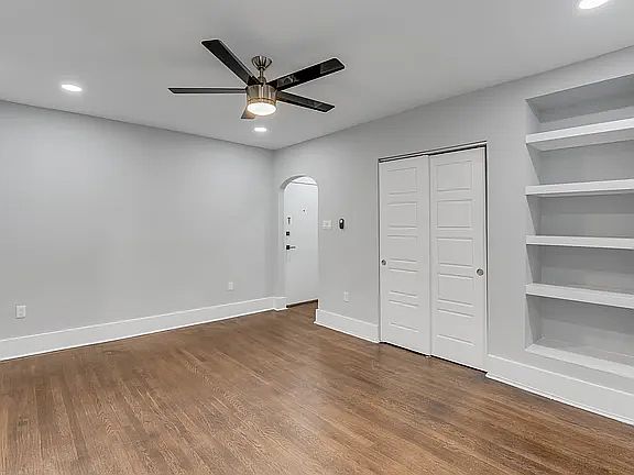 The upgraded bathroom features bright, clean white cabinetry, a modern vanity, and a tub/shower combination with striking white marble look tile. Throughout the apartment, you'll benefit from the comfort of ceiling fans in the main rooms, offering both air circulation and added light, alongside recessed lighting for a clean, modern aesthetic. Additionally, the unit includes convenient built in shelving for easy storage and display.