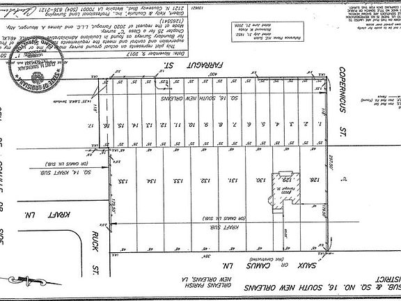 Large parcel plotted for sixteen 25 x 118 front lots on Farragut St. along with eight oversized 48 x 179.50 lots facing Saux Lane. Grand Mansion from 1934 prominently sits on two of the 48 x 179.5 lots boasting many historic attributes. Historic tax credit may be available for renovation or tear down to utilize the oversized parcel for a new development. The property contains a majestic Oak Alley along with grand Cypress trees while being a direct and quick access to the Crescent City Connection. The unpaved street Saux Lane’s application has been submitted and waiting for new applicant to finalize with the city. Agent/Owner.