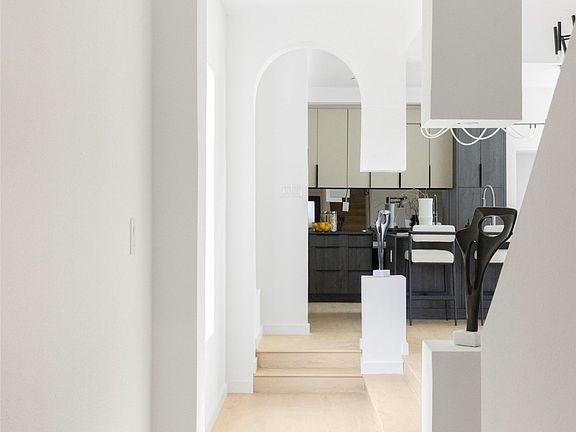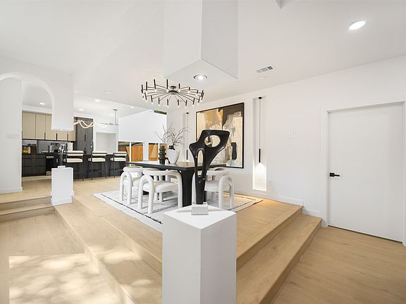 Inside, a dramatic entry with floating arched columns leads you into an elevated kitchen and dining space that flows harmoniously into the sunken living room with 20 foot ceilings — the perfect layout for entertaining. The chef’s kitchen features an oversized island, sleek European-style cabinetry and a gas range, all accented by luxury lighting and commercial-grade finishes throughout.