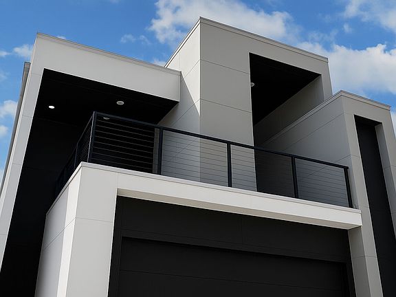 Covered balconyClean architectural linesDramatic entryElevated kitchenAll black soaking tubCommercial-grade finishesOversized island