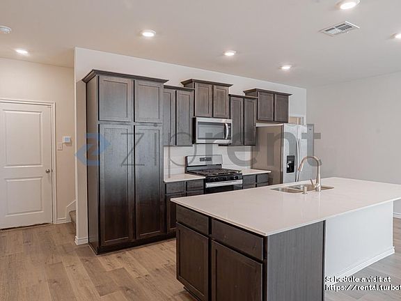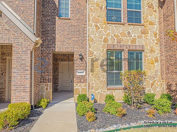 Welcome to this stunning townhouse located at 2020 Saddle Way in the vibrant city of Mesquite, TX. This beautiful home boasts a charming brick and stone facade, offering a warm welcome to all who enter. Step inside to discover a spacious and modern interior featuring an open-concept kitchen equipped with appliances, dark wood cabinetry, and a large island with a sink, perfect for casual dining or entertaining guests. The living area is brightly lit with natural light pouring in through the windows, highlighting the elegant wood flooring and creating a cozy atmosphere for relaxation.