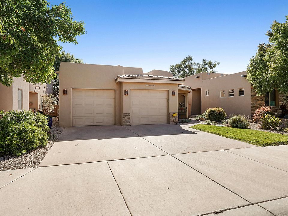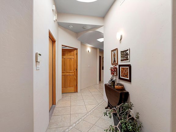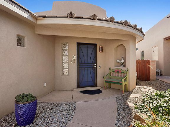 Tucked away in a small gated compound on a quiet tree-lined street, Sydney Place is one of the best-kept secrets in the Near North Valley. Sumptuous living at the perfect scale, high ceilings and custom skylights bathe this contemporary pueblo-style home in natural light. Enjoy mature shade trees and the sound of birds on your private patio; then head out your gate to a shared green space that wraps around the property, showcasing views of the Sandias. With three ample bedrooms and two full baths, this home offers a chance to right-size without losing a sense of spacious luxury - and don't worry about electric bills - owned solar was installed in 2020! Landscaping is attractive and manageable. Make this your forever home or a perfect place to lock, leave, and love coming back.