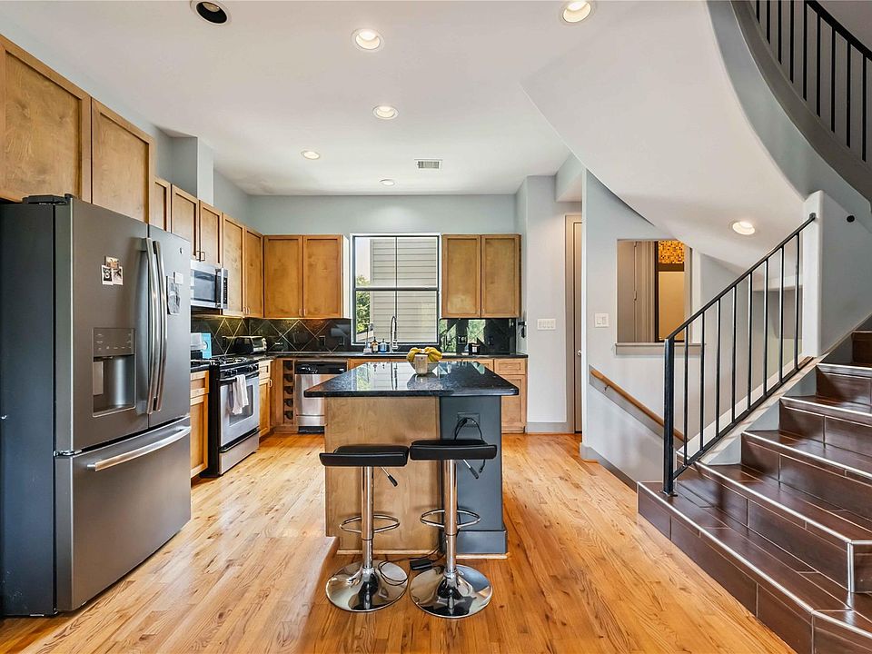 Built-in corner wine storageStainless appliancesView of htownTall ceilingsIsland breakfast bar