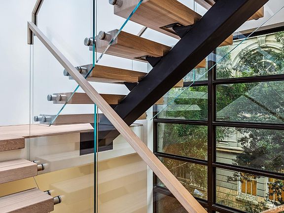 This upper-level townhome is a rare offering with great living space, dramatic details and ample parking in a convenient location. The entry features vaulted ceilings, a contemporary over-lit staircase with fanciful ring-chain chandelier. A great room is accented by the wall-to-wall built-in entertainment center, including a wide gas fireplace hearth and hidden shelves, floor-to-ceiling windows that define the dining area. The chef's kitchen has a large work island, custom cabinetry plus built-in appliances: Wolfe microwave, Viking gas stove with 6-burner cooktop & oversized hood, 2 Bosch dishwashers, SubZero wine-cooler and double door Thermador refrigerator/freezer. From here tall sliding doors access the terrace. A spacious primary suite includes a sitting room and large dressing closet. A sleek bath is fitted with multi-spray fixtures, spa tub, double vanity and textured tilework, accented with contemporary lighting. Upstairs includes a sauna, laundry and office plus 2 spacious bedroom suites that share a grand terrace + 4th ensuite bedroom/den. Exclusive use areas include separate entrance, private elevator, dedicated roof deck garden with firepit, and 2 terraces. A spacious garage provides up to 3-car parking for each unit + storage. A perfectly modern San Francisco home!