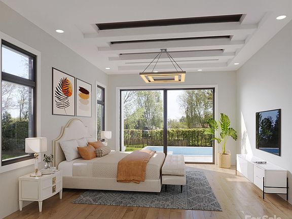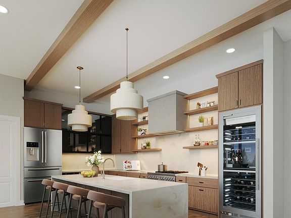 Inside, soaring 12’ ceilings, white oak flooring, and custom wood accents define modern luxury. The chef’s kitchen showcases solid wood cabinetry, quartz countertops, a 48” JennAir gas range, Venetian plaster hood, wine column, and a full scullery with second dishwasher and refrigerator. The great room, featuring a striking three-sided fireplace, opens through multi-slide glass doors to the covered lanai, creating an effortless flow for entertaining.