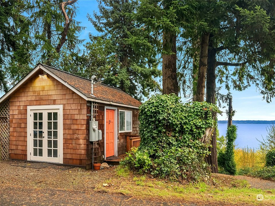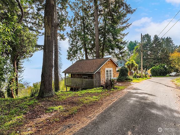 Cute 180 sq. foot shingled building perched over the shores of Puget Sound with beautiful views of city lights and Mt Rainer it could be a great addition to your self-contained camper van weekend. The building has a 200amp electrical panel, roof overhang wrapped side deck on the North side and lower front storage closet. The interior has outlets/switches & lighting, insulation, finished sheetrock, French door, double pane vinyl windows, luxury vinyl plank flooring, Comcast is available, small attic, tiny fridge and water cooler. This is not a building site; no drinking (potable) water is available thus no septic system possible and sadly no beach access from the parcel though public beach nearby.