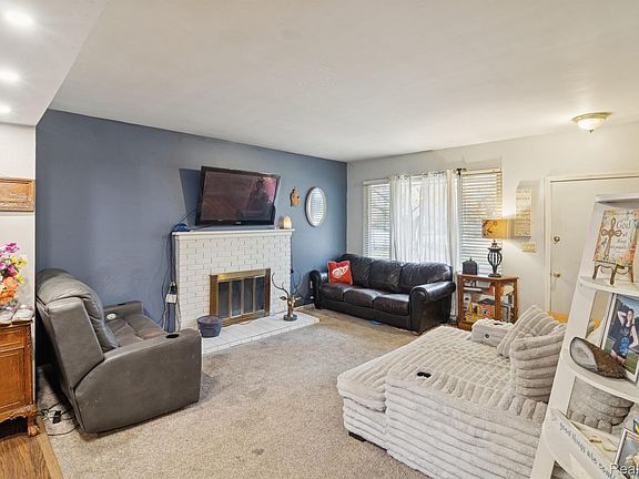 baths. Spacious, light filled living room featuring a natural fireplace and an open floor to a spacious