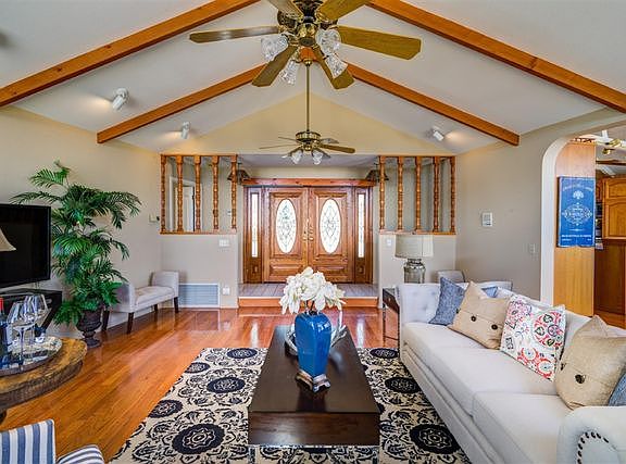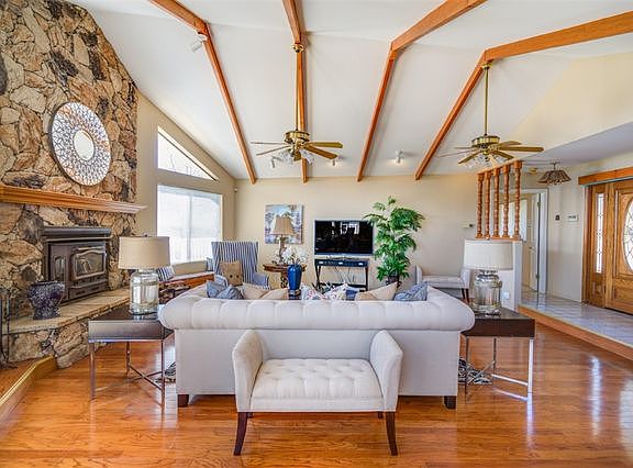 Custom home on 4 usable acres. Zoned for horses.Beautiful views! Well and city water!! Large open concept floor plan with hardwood floors! Dramatic open truss ceilings in the kitchen and dining room.Open beam vaulted ceilings in living room.Sky lights in the hallway. Kitchen features large breakfast bar center island, oak cabinets, black appliances, double ovens and plenty of storage with pullout drawers in Pantry! Mature landscaping, fruit trees & raised beds for the garden enthusiast. Seller will consider all reasonable offers. CC&Rs furnished in Documents.Tax rolls state 2453 sqft. in main living area.The walk out basement, 835 Sqft, is permitted as a storage space with 1/2 bath.