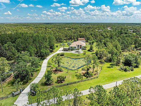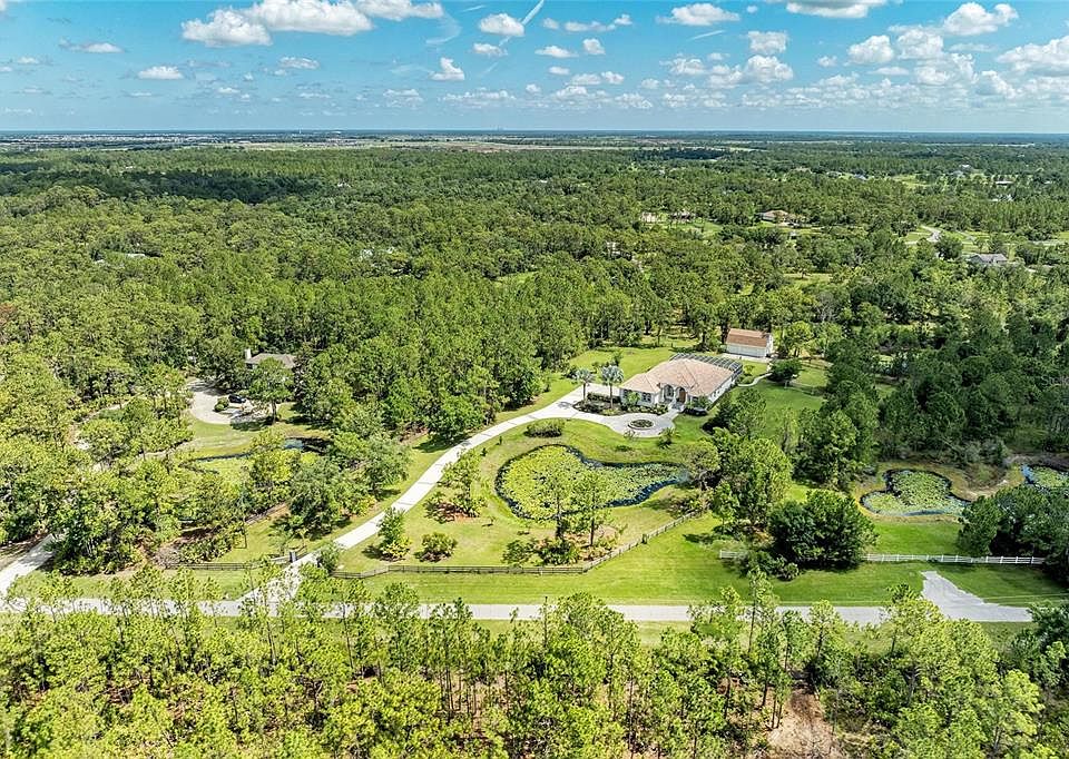 Welcome home to this elegantly REMODELED custom estate set on 5 private acres in the highly desired, equestrian-friendly community of The Forest at Panther Ridge! The Forest is 1 of 9 sections within Panther Ridge encompassing approximately 4,500 acres & 15 miles of scenic trails perfect for hiking or horseback riding. This stunning estate sits on 5 fenced acres consisting of towering pines, oak trees and two ponds on a private, dead-end street. This 3,890 square foot luxuriously REMODELED home has exceptional custom details throughout PLUS a 7 CAR GARAGE (4 car attached to main home & a 3 car detached garage)! The 3 car detached garage has a finished interior complete with spray foam insulation, drywall and paint. UPSTAIRS is a bonus/theatre room providing an EXTRA 595 sq ft., of living space. Dual-Head Mini Split AC system services both the garage area & upstairs bonus room. ALL GARAGE DOORS are MyQ enabled & can be opened & closed with the APP from anywhere! THIS gorgeous home includes 5 bedrooms, 4.5 bathrooms, two of the guest bedrooms are ensuites, a large covered lanai area with a HUGE pool & spa perfect for entertaining & a newer paver walkway leading you to the firepit area & detached garage space. Upon entering the grand foyer you are taken back by the custom details with 14 foot ceilings in the entry and primary bedroom and 12 foot ceilings throughout the rest of the home, elegant columns, tray ceilings and a direct view of the pool area through the 4 large, pocketing sliders. The stunning AND extensive high-end kitchen remodel done in 2021 will take your breath away with no expense spared! Gorgeous 42" white, dove-tailed, soft-close cabinets, GORGEOUS MARBLE TOPS, two islands one being a HUGE family-style island with seating, custom-carved decorative legs & tons of under-counter storage all push to open/close. Franke faucet and Franke fragranite sink which is an exceptionally tough material highly resistant to burns, dents, chips & stains. GE luxury-line Cafe Series appliances including two wall ovens with multi-level convection & one with French door. ALL Cafe Appliances are App enabled & can set custom routines, such as having range hood turn on & off with cooktop. Cooktop is Bluetooth enabled allowing communication with Heat Cue Smart Cookware on the App. You will appreciate the LARGE, DESIGNER lights over the island bringing warmth and elegance to this space. OTHER UPDATES & FEATURES: Tray ceilings, crown molding. 2021: NEW high-end Mannington luxury-vinyl flooring & NEW designer lighting throughout. Guest bath renovations: NEW vanities, tops, faucets, & lighting. NEW fire pit & paver path, NEW Westinghouse/HTP Lifetime stainless steel water heater. 2025: NEW front porch anti-slip tile & NEW painted lanai. NEW pool salt cell & wireless Pentair pool controller. 2023: New pool pump. 2022: NEWLY painted house & detached garage exterior, NEW well pressure switch. 2020: NEW 2.5 ton A/C main house, NEW window balances & locks, wireless irrigation system. 2019: NEW house garage door openers. THIS PEACEFUL & PRIVATE COUNTRY LOCATION is ONLY minutes to Lakewood Ranch, shopping, dining, LWR Hospital, UTC Mall, Waterside & A-Rated Lakewood Ranch schools! A short drive to our area's beautiful beaches & airports! This elegantly remodeled country estate perfectly combines exceptional custom features with a PRIME LOCATION! Come fall in love with this beautiful estate in the highly-desirable Panther Ridge community!