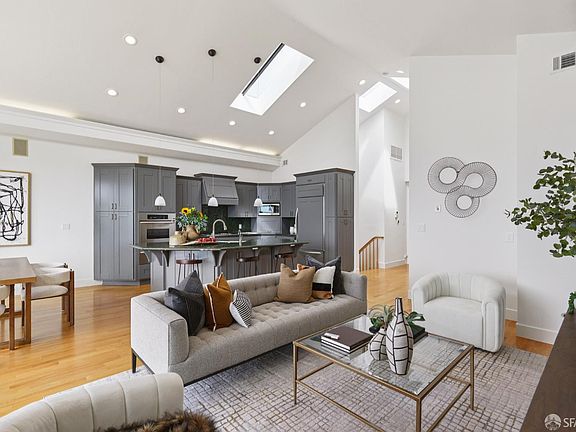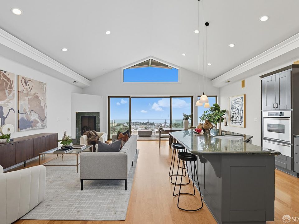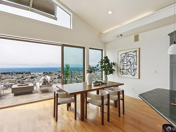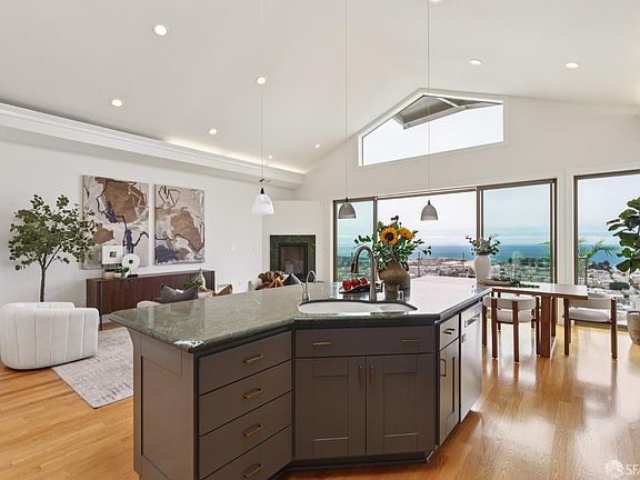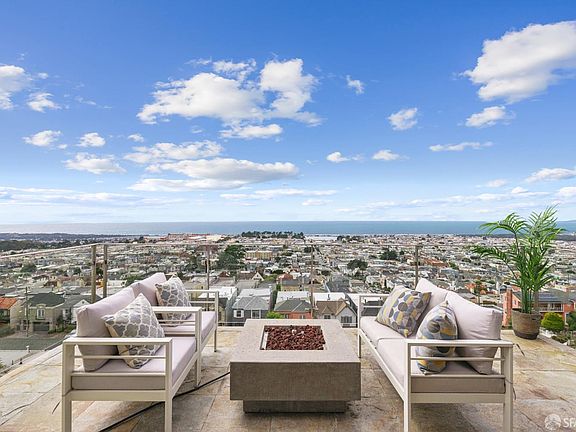 From the moment you arrive, you'll feel the elegance and beauty of this Golden Gate Heights stunner. Cook in your gourmet kitchen, host friends in style, or relax with family all while soaking in sweeping, ocean views. The living and dining rooms flow effortlessly onto an expansive terrace where the sky meets the sea. Bathed in natural light from five skylights, the open floor plan balances comfort and sophistication with vaulted ceilings, cozy fireplaces, and walls of glass that frame breathtaking sunsets. Two bedrooms and a full bath are conveniently located on the main level, offering comfort and flexibility for family or guests. Downstairs, the primary suite is your private retreat: floor-to-ceiling windows overlooking the horizon, a spacious walk-in closet, an office nook, and a spa-like primary bathroom suite. The home's original circular staircase ties it all together, leading to two levels of modern living with a spacious garage (interior access included), separate laundry room, ample storage, and an easy-maintenance backyard. The house was gutted to the studs in 2005; it's updated and modern. All this, just a block from Golden Gate Heights Park and the #6 Muni line with West Portal shops and transit moments away.
